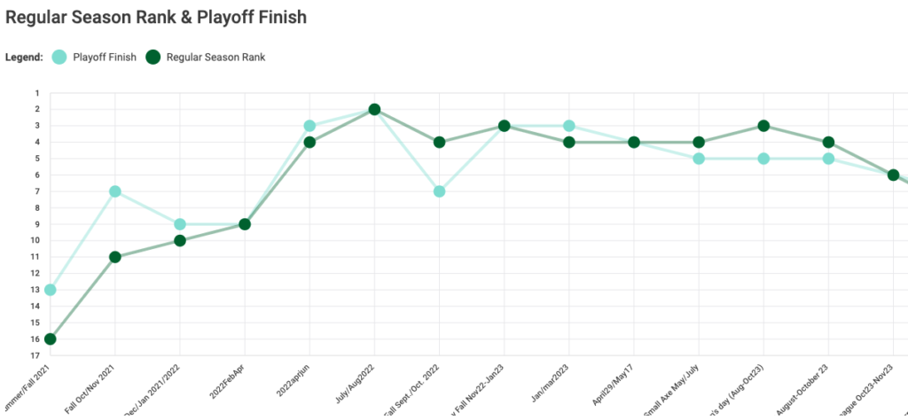 So if we look at my overall regular season rank and playoff finish record, you can see that I climbed pretty quickly after a few leagues, stabalized for a while, and then started creeping back down. Now, I really can’t explain why I’ve started dipping (at least not from one cute graph), but the proof is in the pudding, really.