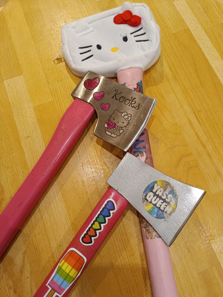 My hatchet Tisha is the same Coldsteel Comp that I’ve been throwing since day one, and she’s been joined recently by my clutch axe Kitsy – who is a Queen of Hearts with a cute Hello Kitty engraved into her courtesy of Pendragon. Finally I have Hanneke, who is my lovely Draper big axe. Unfortunately if I’m being truly honest she is a bit of a big lump, and my big axe throwing definitely needs a lot of work, so there may be an awkward conversation to come between the two of us!