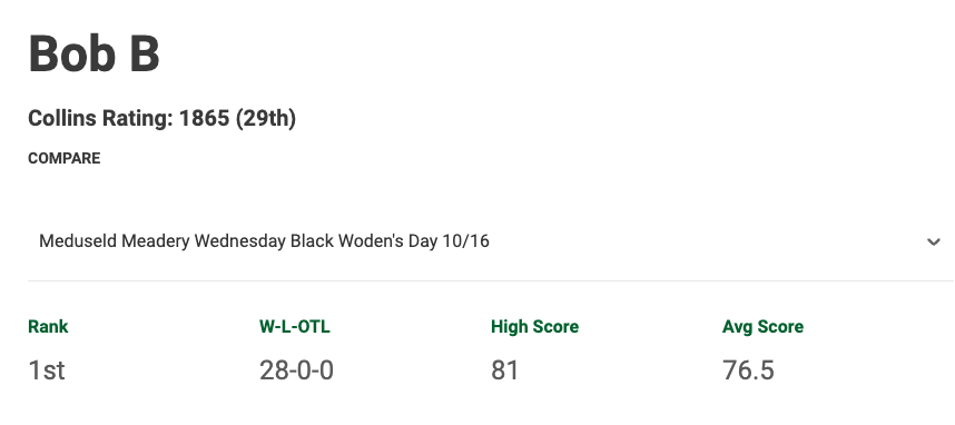 But I kinda knew the game was up once I was battling against Bob for the first spot last night. Because the dude had a perfect season, threw an average of 76.5, and…I mean…he’s Bob.